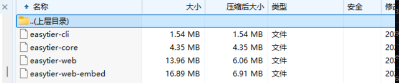easytier-core:EasyTier 的核心程序easytier-cli:EasyTier 管理程序,启动 easytier-core 后,可以使用 easytier-cli 查看虚拟网信息easytier-web: 用于自建 EasyTier 的 Web 控制台后端,一般情况下无需自建,使用官方提供的 Web 控制台即可easytier-web-embed: 用于自建 EasyTier 的 Web 控制台后端,自带web界面,避免还需要单独放置web界面文件