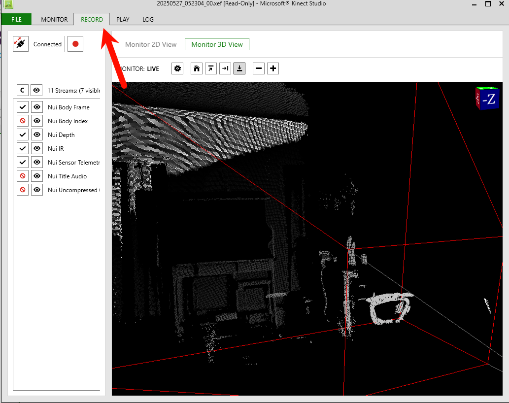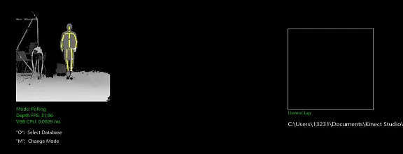 打开Kinect Studio,在RECORD页面下录制需要的动作。录制后的文件存放在用户的文档文件夹下的\Kinect Studio\Repositorym目录下
