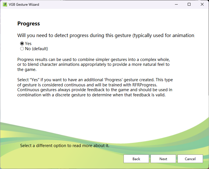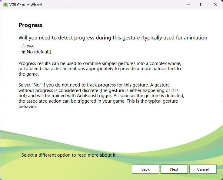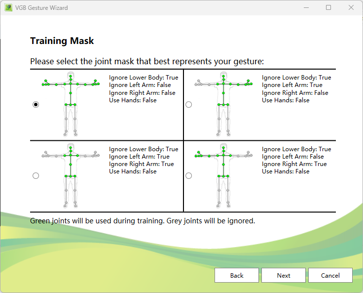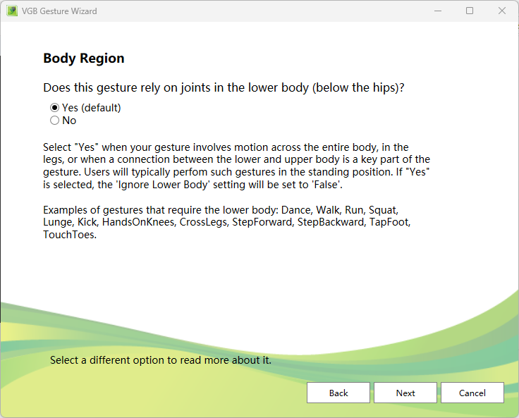 然后,选择是否需要下半身的信息。这个选项的意思是,Kinect可以捕捉人全身的骨骼结点信息,如果你的动作与下半身无关,那么你只需要上半身的结点信息就可以了。由于我要演示的例子是挥手,自然和下半身没有任何关系,所以我选择No。