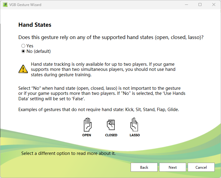 接下来设置手势识别,Kinect可以识别三种手势,打开、关闭、半开三种状态。我不需要识别手势,所以我选择了No。
