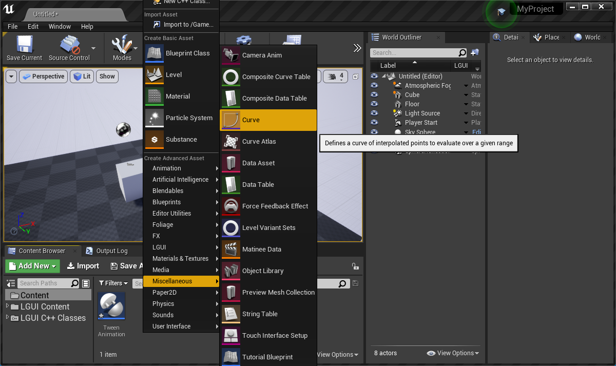 在内容浏览器右键选择曲线,弹出框选择CurveFloat。