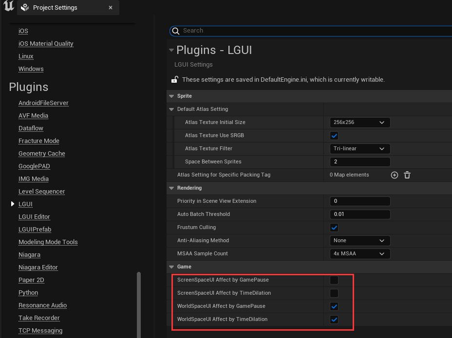 对于 LGUI 的 ScreenSpaceUI 元素,如果使用自己的函数创建补间(例如 UIItem.WidthTo),则它会自动调用 SetAffectByGamePause(false) 和 SetAffectByTimeDilation(false),因此 UI 不会受到这两件事的影响(就像 UMG 一样)。这可以通过更改 LGUISettings 来改变;同时,UMG也是如此。