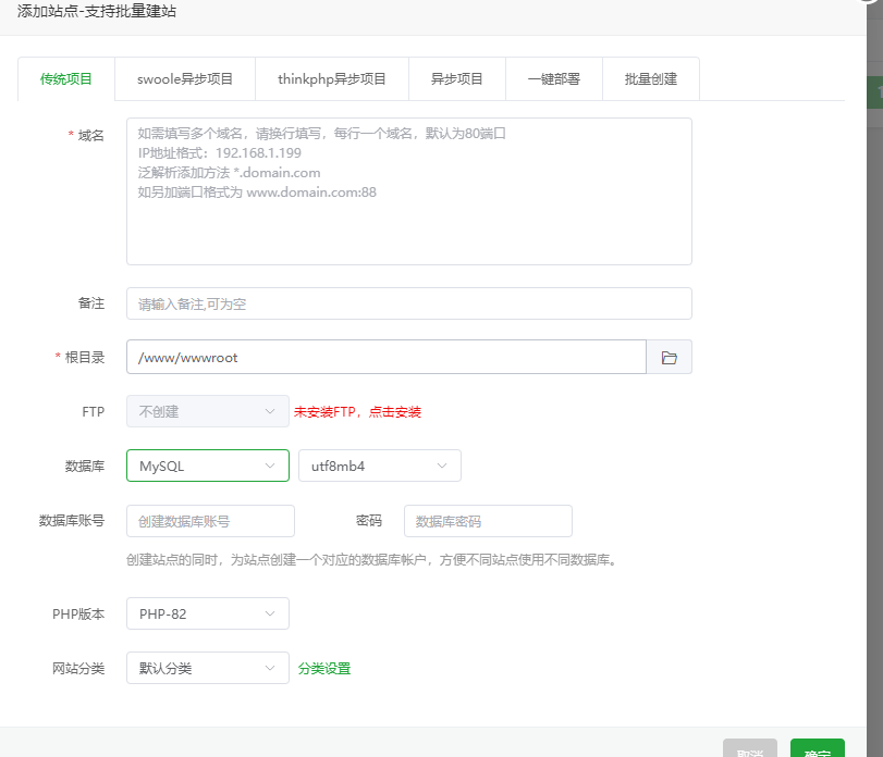 在面板网站创建站点,可以在这里直接创建数据库,指定运行环境为你安装的php版本。