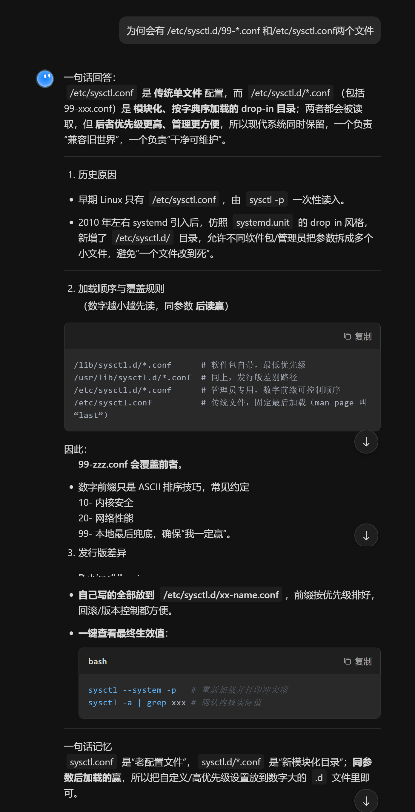 AI给的建议是,创建一听一个优先级高的文件,来覆盖原本的,个人觉得没什么意思,就直接改了(/etc/sysctl.conf直接删除),这里就智者见智仁者见仁