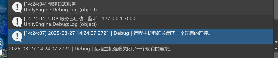如下图所示,使用一个UDP服务向多个远端发送消息,只要有一个对面没有启动UDP监听,就会触发如下信息,这个时候当前UDP服务调用发送函数仍能正常发送,但是接收是废了的。
